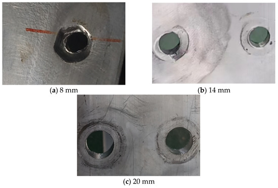 In the case of bolted joints, the size of the bolt diameter will have an impact on the joint stress state [22]. Figure 5 depicts the state of the wall of the bolt hole in the aluminum alloy I-beam after loading and failure of beam joints that varied in diameter. When the diameter of the bolt was 8 mm, there was an obvious crushing failure on the wall of the bolt hole [22]. With the bolt diameter being 14 mm, some walls of bolt holes exhibited obvious squeezing, whereas some walls exhibited no obvious compression. When the bolt diameter was 20 mm, the wall of the bolt hole was intact and undamaged. According to the analysis results, it can be concluded that when a larger bolt diameter is adopted, the bolt hole wall will not experience compression damage.