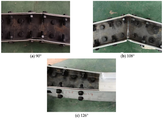 From previous research [22], it can be concluded that for AAPFs, the influences of joint arch angle and bolt diameter on their mechanical performance should be fully considered. Hence, the number of beam-beam joint specimens envisaged in the present section totaled 5, and Table 1 lists the variables for every specimen. According to this table, it can be inferred that this experiment mainly envisaged specimens that vary in bolt diameter (8 mm, 14 mm, and 20 mm) and arch angle (90°, 108°, and 126°) to explore how the load-bearing performance of the AAPF beam joint is impacted by these two parameters [22]. The definition of arch angle is consistent with Section 3, which refers to the arch angle of AAPF roof, rather than the angle between beam joints. It should be pointed out that other structural parameters of the beam joint remained consistent when studying the effect of arch angle or bolt diameter.