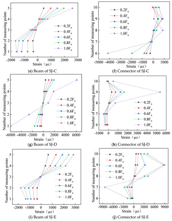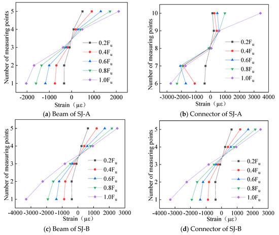 From research on the strain distribution state of the entire cross-section of H-shaped beams and C-shaped connectors, the strain results obtained from experiments along the height distribution of the cross-section for each specimen are summarized in Figure 7. In Figure 7, Fu represents the ultimate load. Based on the strain graph curves under different loads, it can be concluded that (1) for every specimen, the cross-sectional strain distributions were fundamentally consistent between the channel steel connectors and the aluminum alloy beams. This is attributable to the fundamentally consistent mechanism for force transfer in every specimen. (2) Obviously, since the aluminum alloy beams were primarily subjected to bending moments under vertical loads, their overall strain tended to be greater on the beam flanges, while it was less on the beam web. (3) In the case of the channel connector, the strain was greatest at the intersection of the lower and upper flanges and the web, while it was comparatively smaller between the flanges and the web. This is because the channel type connector mainly bears shear force near the loading point. (4) Due to unpredictable errors in some strain gauges during the loading process of the specimens, some test structures underwent peculiar changes. However, these peculiar data will not affect the regularity of the experimental results in this section.