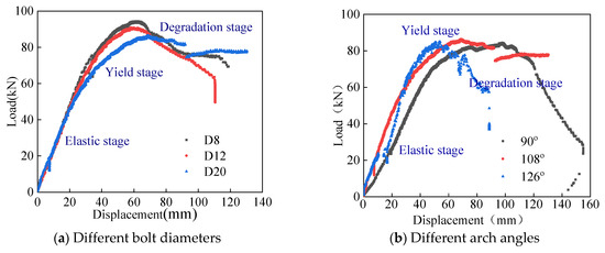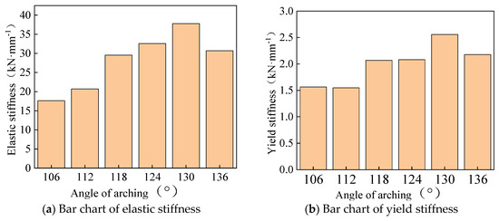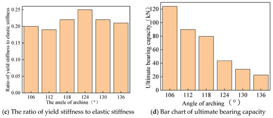 (1) The elastic stiffness of specimens with different arch angles in the elastic stage under vertical load (Figure 12a) showed a variation pattern of first increasing and then decreasing. As the arch angle increased (106° to 130°), the vertical elastic stiffness increased by two times, and when the arch angle increased from 130° to 136°, the vertical elastic stiffness decreased by 23%.