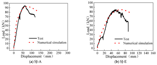 With the use of the above methods, the numerical analysis models of SJ-A and SJ-C were established, and the results of the simulation were compared with the results of the test, which can be found in Figure 11 and Table 3. By comparing the experiment and numerical simulation results, it was found that the tangent slope of the load-deformation curve in the elastic stage of the numerical model was slightly higher than the test result. This was because there were no defects in the joints in the numerical model, but defects could not be avoided during the production and loading process of the test specimen. In the next stage (plastic stage), the load-deformation curve of the numerical simulation was relatively smooth, while the load-displacement curve of the experiment showed an obvious strength degradation phenomenon. This was because the ideal elastic-plastic model of material was used in the numerical model, without considering the degradation characteristics of the material. Overall, the load-deformation curves of the test and numerical model were in good agreement, and the error of the ultimate load and ultimate displacement was within 5%.