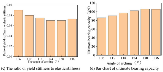 (4) With the increased arch angle, the ultimate load of the specimen under vertical load gradually increased. As the arch angle increased from 106° to 136°, the vertical ultimate bearing capacity increased by 1.2 times, as displayed in Figure 12d.