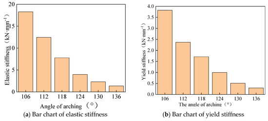 (3) The ratio of yield stiffness to elastic stiffness of joints under horizontal forces is shown in Figure 13c. With the change in arch angle, the ratio of yield stiffness to elastic stiffness was 0.20–0.25.