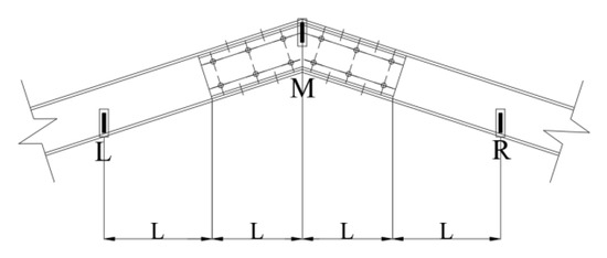 The displacement monitoring layout points of AAPF beam-beam joints are shown in Figure 14. L in Figure 14 represents the radius of the joint domain. We installed a displacement sensor at the center of the joint domain and placed one on both sides (left and right) 2 L away from the center. The method for calculating the vertical and horizontal deformation of the beam-beam joint is: