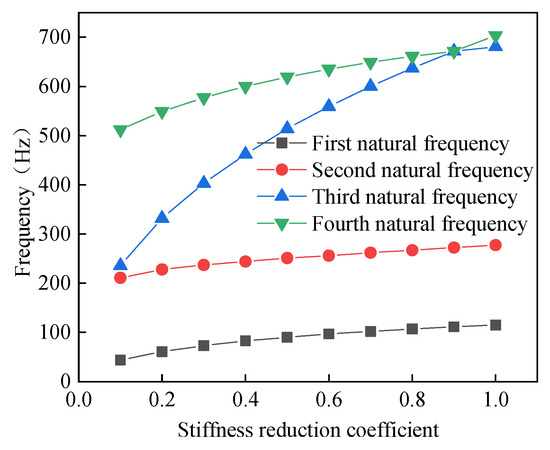 Frequency monitoring [29,30] is currently a highly accurate method in the area of building structures. From the previous study, it is known that the yield stiffness of the beam-beam joint is much lower than that at the elastic stage. Thus, to research the effect of natural frequency on stiffness, numerical analysis models with different stiffnesses were established, and the frequency variation pattern is shown in Figure 15. As the joint stiffness decreased, the first four natural frequencies of the joint gradually decreased. When the stiffness of the joint decreased from elastic stiffness to 0.1, the first natural frequency reduced by 70 Hz, the second frequency reduced by 66 Hz, the third frequency reduced by 443 Hz, and the fourth frequency reduced by 196 Hz. Due to the fact that the maximum amplitude of natural frequency variation was in the third order, the deformation of the third-order vibration mode should be mainly monitored during health monitoring.