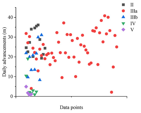 A common method for TBM performance prediction is combining TBM performance with the classification of surrounding rock mass [27]. Innaurato [28] improved Cassinelli’s [4] TBM prediction model by adding uniaxial compressive strength. One of the most famous TBM prediction models based on rock mass classification is the QTBM proposed by Barton [29]. This classification method is based on an extended version of the Q system and takes all rock and machine parameters that affect the advance speed into account. Alber presented RMRTBM, which is a modified RMR system for use in TBM tunneling projects [3,11]. Sapigni presented an improved RMR system for TBM construction, which indicated TBM performance reaches a maximum in the rock mass rating (RMR) range of 40–70 [30]. Bieniawski proposed the concept of the rock mass excavability (RME) index, which the authors found very effective in predicting the excavability of rock masses by TBMs using quantification of TBM performance [31]. By employing multiple and polynomial regression analyses on field data, Khademi attempted to provide a functional predictor equation of the TBM field penetration index (FPI) by using the RMR rock mass classification system [32]. Frough [33] examined the relationship between the rock mass conditions, essentially described by the rock mass rating system (RMR) and TBM performance parameters using field data. Salimi studied the possibility of developing a new rock mass classification system for TBM application by using site-specific models and Genetic Programming (GP) for the analysis of a TBM performance relative to the ground condition data [34]. Although the aforementioned studies have conducted targeted investigations on TBMs and considered the correlation between surrounding rock and driving parameters, they have not accounted for the influence of nonconstruction factors, thus impeding accurate prediction of actual construction advancements. As illustrated in Figure 1, there is no obvious relationship between traditional classification levels (II, IIIa, IIIb, IV, Ⅴ) and daily advancements.