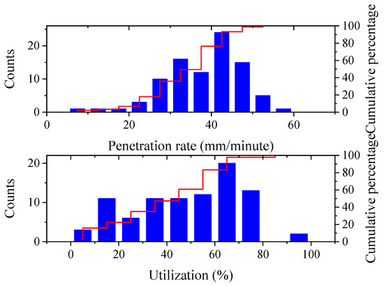 As we can see from Figure 3, a normal distribution can describe the variability in penetration rate and utilization. The combination of penetration rate and utilization can be used to estimate the daily advancements under different working conditions. The project’s statistical data are categorized into four groups based on daily advancements of 0~10, 10~20, 20~30, and 30~40 m per day. The average value x and standard deviation s of penetration rate and utilization are calculated for each group to determine the fluctuation range {(x − s)~(x + s)}, shown in Table 2 and Table 3. Subsequently, the information is utilized to generate a table predicting daily advancements.