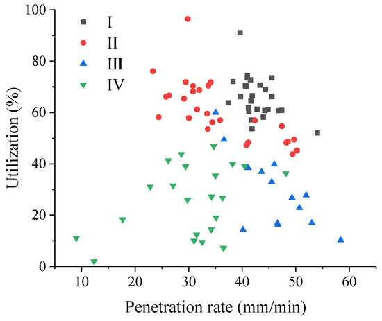 From Table 5, the specific arrangement of the boreability classification matrix can be analyzed. There is a lot of research on the prediction of TBM performance [6,14,15,19,32], which is the penetration rate in different rock masses. However, we could conclude from this research that the daily construction progress is not linearly related to the penetration rate, it is also influenced by utilization. As Khetwal’s research suggested [35], the utilization of TBMs was influenced by many factors, and the utilization accounts for a large proportion of the boreability classification. This shows that during the TBM tunneling process, the construction progress is largely determined by the operation of the mechanical equipment. The key to improving mechanical construction speed is to improve the utilization of the equipment.