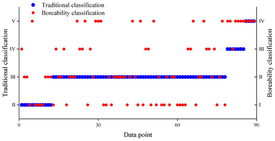 It can be seen from Figure 5 that the boreability classification category is quite different from the traditional one. The classification matrix presented above can be utilized to determine the rock mass classification for excavation purposes; however, obtaining real-time data on penetration rate and utilization during the process is challenging. These parameters can only be indirectly obtained through their relationships with other complex variables that cannot be directly calculated using mathematical models. Therefore, developing a multiparameter prediction model has become the preferred approach for predicting rock mass boreability classification.