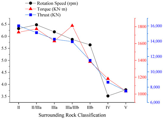 According to the engineering data studied in this paper, the thrust and the rotation speed have a relatively consistent trend with the classification of surrounding rock in traditional underground engineering, but the torque of TBMs is not completely consistent with the traditional classification (Figure 6). According to the above analysis, the three TBM mechanical parameters are selected to predict the boreability of surrounding rock.