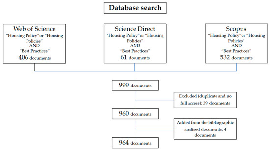 The search for housing policy/housing policies was combined with the best practice term to create three selection lists from different databases. Phase 02 is framed from Web of Science, 61 from Science Direct, and 532 from Scopus. The resulting 999 documents were processed in Microsoft Excel to eliminate duplicate articles and those without free access to the full text, leaving 960 valid documents. Four additional documents were also identified and cited in the bibliographic references, satisfying the pre-defined criteria for the initial research. The final selection resulted in 964 documents. Phase 02 is framed in Figure 1.