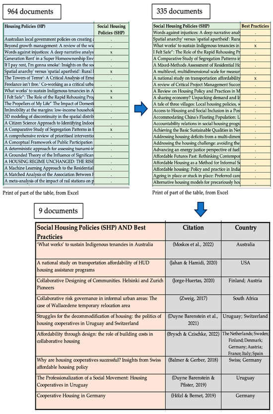 The focus of the research shifted to Phase 03, which involved sifting through 964 documents on Housing Policies. Out of these, 335 were selected concerning SHPs; from that pool, nine were chosen based on best practice studies. In Figure 2, it is possible to see the partial list of the 964 documents on Housing Policies and the partial list of the 335 documents on SHPs. The nine documents on best practices are presented in the full version.