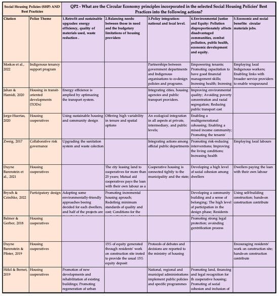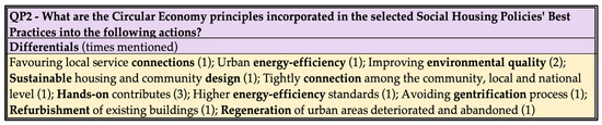 QP2—What are the Circular Economy principles incorporated in the selected Social Housing Policies’ Best Practices (SHBP) about the following topics?