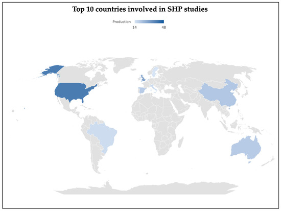 The present study constructed a graph visually representing the relationship between countries and their respective research themes. Figure 8 displays the ten countries in ascending order of the number of publications, each associated with its corresponding research theme. The green gradient on the graph denotes the number of publications from a particular country, with lighter shades indicating fewer publications and darker shades representing higher numbers. The selection of the 16 research themes was based on an ABC curve and encompasses 82% of the total publications analysed in this SLR.