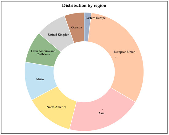 Figure 6 showcases the top 10 countries with the highest research production in this area. Out of the 335 documents analysed, it was found that countries in the European Union produced 32% of the studies in this SLR. The EU nations devote 57% of their studies to the theme of segregation and its causes and implications, including poverty resulting from economic crises, migration, unregulated market control, unchecked gentrification, and ethnic prejudice. China collaborates with 30% of Asia studies, and Brazil represents 40% of the studies in Latin America and the Caribbean. Figure 7 illustrates the production by region.