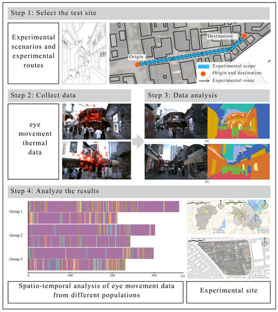 The overall framework of the study on the perception of commercialized historic streets: It elucidates the process of data collection using eye-tracking technology, followed by data analysis employing methods such as interest point identification and semantic segmentation.