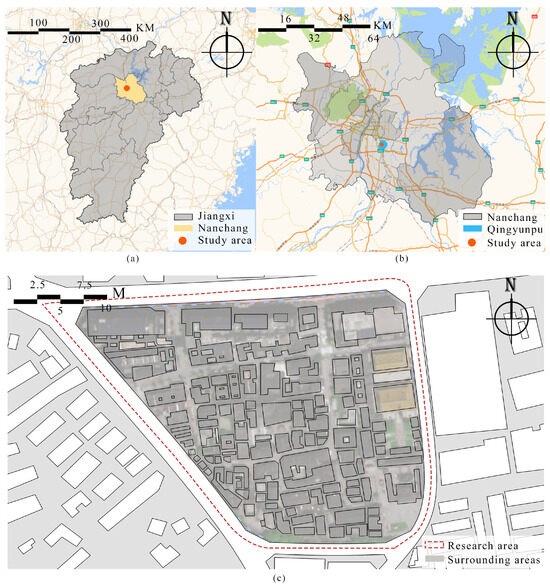 The map of the research area. (a) the location of Nanchang City within Jiangxi Province; (b) the position of the study site in Nanchang City; (c) the research site: Wanshou Palace Historical and Cultural Block.