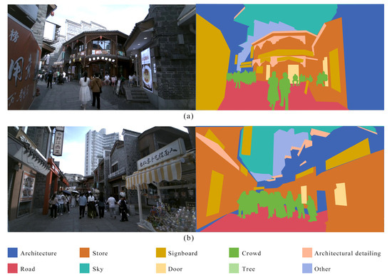 Semantic segmentation of environmental elements ((a,b) are street view images and semantic segmentation images of different parts of the street).
