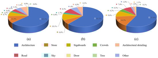 As depicted in Figure 7, different groups of participants exhibit distinct gaze patterns. Among participants with a background in architecture, their gaze duration prioritizes architectural elements, followed by commercial, road-related, landscape, and other elements. These participants tend to perceive the overall spatial and architectural forms first, seeking characteristic elements from spatial compositions and aesthetic forms. The gaze duration on architectural elements accounts for 68.6%, with overall architecture at 63.1% and architectural details at 5.5%. Based on participants’ verbal feedback during the tests, their attention to architectural details ranks as follows: eaves, doors and windows, pillars, and archways. Over 50% of participants showed prolonged attention to specific architectural elements, indicating heightened interest in the area.