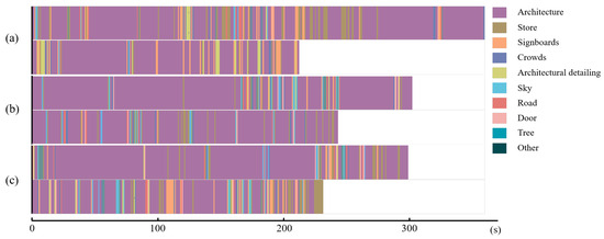 Throughout this process, individuals’ attention may be influenced by environmental features and shift accordingly, as illustrated in Figure 9. For instance, as they enter bustling commercial areas, they may pay more attention to shop signs and product displays. Conversely, when they stroll into quieter historic districts, they may become more focused on the history and cultural significance of the buildings. Moreover, as subjects pass by specific landmarks or striking buildings, we observe brief pauses and repeated revisits of their gaze points. This pattern reflects the role of these landmarks in guiding visual attention and memory. In the middle section of the street, gaze duration more frequently shifts between shops and historical buildings, indicating the influence of commercial activities on visual attraction. As subjects approach the other end of the street, their gaze tends to concentrate more on individuals, as this area tends to have more functional zones and social interaction points. Overall, we find that the shift in gaze targets is closely related to the subjects’ specific positions on the street. Their gaze behavior not only reflects their perception of the environment but also is influenced and guided by the surrounding context. The distribution and duration of these gazes reveal the visual significance of different areas and locations within the street environment.