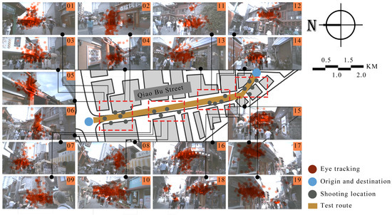 The main task route distribution is illustrated in Figure 3, showcasing a rich blend of ancient architecture and commercial elements such as shops and signage, effectively reflecting the situation of the commercialized historic street. Moreover, it traverses through the commercialized historic district, providing a comprehensive insight into the visual perception changes of visitors upon entering the commercialized historic area, based on the timeline of eye-tracking data. Through the analysis of eye-tracking data along the timeline, it reveals pedestrians’ varying levels of attention to the environment during different time periods, their interest levels in specific landscape elements, and the timeline of their behavioral decisions, thus offering a more comprehensive understanding of pedestrians’ visual cognitive processes in the commercialized historic district.