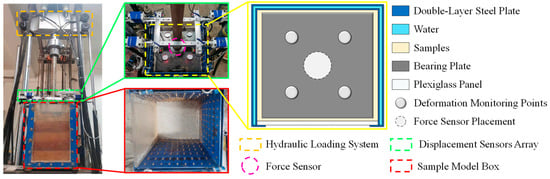 The research team developed a specialized testing apparatus to investigate the expansion and compression deformation characteristics of weak expansive rocks with a typical sandstone intercalated with mudstone interbedded structure when immersed in water. This apparatus, depicted in Figure 1, is designed to measure the expansion and compression deformation characteristics of weak expansive rocks under applied loads. The primary components of the equipment include a sample model box, a hydraulic loading system, a force sensor, and an array of displacement sensors.