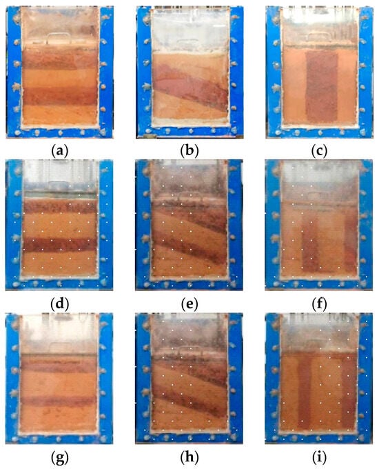 Sample filling scheme diagram: (a) Thickness Ratio 1:1–Flat Layer; (b) Thickness Ratio 1:1–Oblique Layer; (c) Thickness Ratio 1:1–Vertical Layer; (d) Thickness Ratio 2:1–Flat Layer; (e) Thickness Ratio 2:1–Oblique Layer; (f) Thickness Ratio 2:1–Vertical Layer; (g) Thickness Ratio 3:1–Flat Layer; (h) Thickness Ratio 3:1–Oblique Layer; (i) Thickness Ratio 3:1–Vertical Layer.