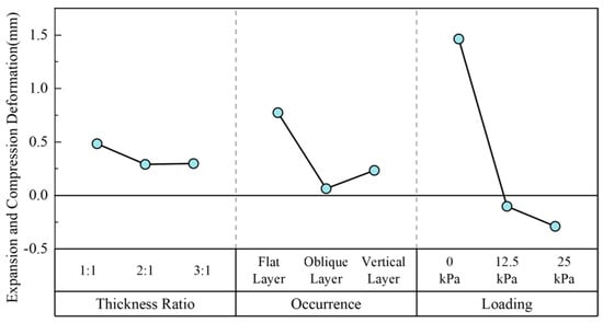Figure 3 clearly illustrates that the loading is the predominant factor influencing the expansion and compression deformation of sandstone intercalated with mudstone. This is followed by the occurrence and the thickness ratio. As these factors increase, the samples tend to undergo compression deformation. It is evident that as the ratio of sandstone to mudstone layer thickness increases, the mudstone content diminishes progressively. Consequently, the interior content of the hydrophilic clay minerals also decreases, which is manifested in the reduced expansion deformation of the water-saturated sample. The overlying load significantly inhibits the water-immersed expansion deformation of weak expansive rocks. Thus, with an increase in the loading, the expansion deformation of the weak expansive rocks with an interbedded structure also gradually diminishes. When the loading value escalates to match the expansive force of the sample, the expansion deformation reaches zero; if the loading continues to rise, the sample undergoes compressive deformation. Among these nine sets of experiments, the minimum value for deformation is −0.61 mm (indicating compression deformation), while the maximum value is 2.28 mm (indicating expansion deformation), with a minimum absolute value of −0.06 mm. The factor combinations corresponding to these three groups are A1B2C3, A1B1C1, and A2B1C3, respectively. Based solely on the result data, it is challenging to precisely determine the impact of rock occurrence on the water-immersed expansion and compression deformation of sandstone intercalated mudstone samples. However, it can be tentatively deduced that an increase in the rock inclination angle restricts the expansion deformation of weak expansive rocks, a hypothesis that requires further validation through subsequent experiments.