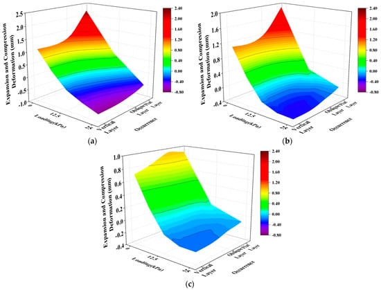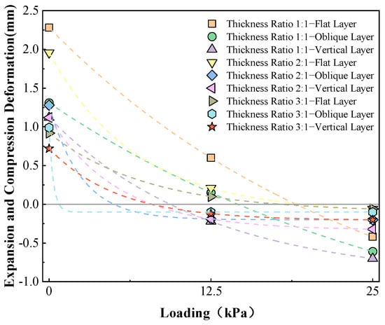 As the loading increases to 25 kPa, as depicted in Figure 6c, the entire sample exhibits compression deformation. In this instance, the impact of the layer thickness ratio on the sample’s expansion and compression behavior in water immersion significantly outweighs the occurrence of rock strata. Furthermore, when the layer thickness ratio is at least 2:1, the overall expansion and compression behavior of the sample remains largely unaltered. If the foundation contains a relatively small amount of weak expansive rocks, it is unnecessary to consider the influence of rock occurrence. Instead, it suffices to manage the overlying load value of the weak expansive rocks through embankment filling reinforcement design, ensuring that expansion deformation does not occur. This approach minimizes the need for extensive land replacement, thereby reducing the overall cost of the project.