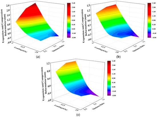 To elucidate the impact of diverse factors on the expansion and compression deformation behaviors of sandstone intercalated with mudstone interbedded structure samples, three parameters—thickness ratio, occurrence, and loading—were designated as control variables. The stable expansion and compression deformation of the samples under uniform control conditions were portrayed through a 3D mapping surface, generated by the integration of these factors. This approach allowed for a visual representation of the sample’s expansion and compression deformation characteristics. The ensuing analysis outcomes are delineated in the subsequent sections.