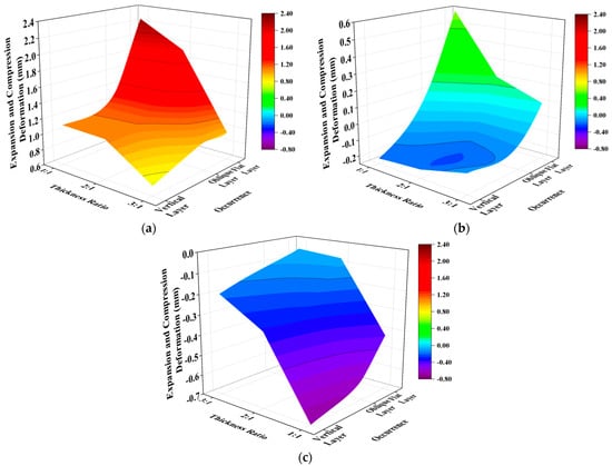 Overall, as the layer thickness ratio continues to rise, the absolute value of the sample’s expansion and compression deformation also diminishes gradually, which is represented by a lighter color on the 3D mapping surface. Analysis indicates that an increased layer thickness ratio leads to a reduction in mudstone content within the sample. This limits the expansion deformation caused by the water absorption of hydrophilic mineral components, allowing the accumulated expansion deformation to easily dissipate along the sandstone layer. During compression deformation, the decreased mudstone content also results in fewer internal pores. Consequently, the dynamic expansion of mudstone rapidly fills these pores, hindering particle sliding and compaction. Moreover, since the sandstone is relatively dense, the overall compressible space within the sample of expansible rock with a weak interbedded structure is limited, resulting in a smaller absolute value of compression deformation.