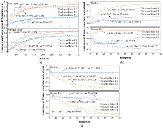 Considering the scarcity of engineering cases involving vertical layer (90° inclination angle) weak expansive rock formations with interbedded structures, this study focuses on analyzing test results for flat layer (0° inclination angle) and oblique layer (30° inclination angle). The time-history curves depicting the expansion and compression deformation of both the flat and oblique layer samples were plotted. These curves were subsequently fitted with hyperbolic functions, with the specific results being displayed in Figure 7.
