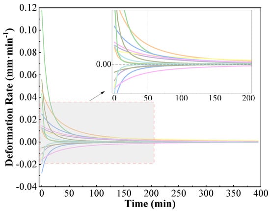 The time-history curves of expansion and compression deformation that demonstrated a superior hyperbolic fitting effect were selected. Subsequently, the first-order derivatives of these fitting curves were calculated, respectively. This enabled the plotting of the sample’s deformation rate over time under the influence of various factors, as depicted in Figure 8.