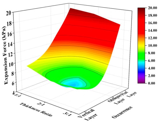From Figure 10, it is evident that the expansion force of the weak expansive rock sample, characterized by an interbedded structure of sandstone and mudstone, diminishes as the layer thickness ratio and rock inclination angle increase. The calculated reductions are within the ranges of 8.91% to 38.68% and 51.00% to 58.83%, respectively. The data indicate that the expansion force is more significantly influenced by the rock occurrence level than by the layer thickness ratio.