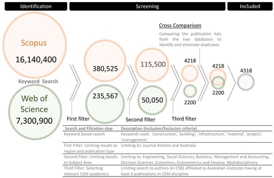 The second step of this hybrid approach is to ensure that only CEM-related publications of the shortlisted academics are considered for final review and the research of 158 shortlisted academics in other disciplines is not considered for review. For this purpose, keywords associated with the concept of CEM were used. Keywords were selected using both the inductive and deductive reasoning approaches. A preliminary literature review of over 100 publications was conducted to develop a list of keywords using inductive reasoning. Subsequently, a search on Scopus and Web of Science was conducted using selected keywords, such as ‘construction’, ‘building’, ‘infrastructure’, ‘material’, ‘project’, and ‘management’. The search was limited to selected 158 academics, relevant subject areas, and Australian institutions. The search conducted without considering the preselected 158 academics resulted in 115,500 and 50,050 journal articles in Scopus and Web of Science, respectively. Upon limiting the search to handpicked 158 academics, 4218 and 2200 journal articles were shortlisted from Scopus and Web of Science, respectively. A majority of the articles occurring in Web of Science database were also indexed in Scopus. Upon adding the shortlisted articles from two databases and removing the duplicates, 4318 relevant publications were identified, and the review presented in this paper is based on those publications only. These publications only represent journal research articles and do not include books, conference proceedings, and review articles. It is important to indicate that CEM research in Australia is not limited to 4318 publications; however, the selected publications are highly representative of the CEM research trends in Australia.