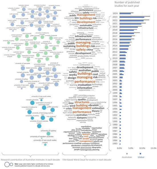 The universities which have consistently contributed high number of studies in the subject area for multiple decades include Curtin university (n = 468; 12.5%), University of New South Wales (UNSW) (n = 468; 12.5%), Royal Melbourne Institute of Technology (RMIT) university (n = 467; 12.5%), Queensland University of Technology (QUT) (n = 465; 12.4%), Deakin university (n = 427; 11%), and Western Sydney university (n = 399; 10.6%). These institutions also contributed larger publication volume in terms of the total number of published studies from 1983 to 2024.