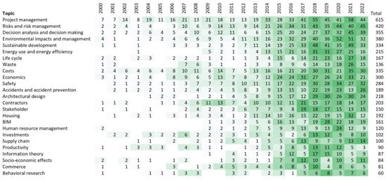 Figure 5), indicating that for most of the popular research topics there is a gradual increase in attention (in terms of number of published studies) on a timescale. For the topic of environmental impacts, protection, and management, the publication volume peaked in 2020 and 2021; for energy use and efficiency topic, the publication volume peaked in 2018 and 2019; publication-number on the contractor-related issues had multiple peaks during 2009–2010 and in 2017; publication number on BIM topic peaked in 2019; and publication number on investment topic peaked from 2018 to 2019, to name a few.