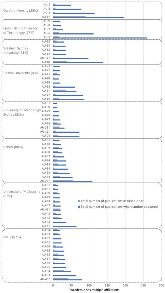 Figure 6). These trends indicate multiple potential reasons which can be investigated and verified by future inquiries. For instance, in the case of Curtin University, Queensland University of Technology, and Western Sydney University, 80% of the CEM research is authored by six or less academics. This may imply that, in these institutions, graduate-level students may not have many supervisors to select from. It may also mean that some of the top-performing academics in these institutions (i.e., with the highest publication volume) have relatively long tenures of service in these institutions. Opposite scenarios are possible in the case of institutions with a high number of academics contributing to 80% of the CEM research volume, for instance, RMIT, University of Melbourne, and UNSW. In these institutions, CEM-related departments may be more established, and the graduate-level students may have relatively more supervisors to select from. Also, the top-performing academics in these institutions may have joined the institution recently or may have relatively short tenures of service in these institutions. Some or all of these possible scenarios may hold true in the case of Australian institutions; however, they need to be verified by future studies.