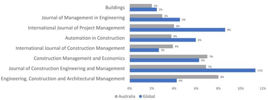 Figure 8. The global share of CEM studies published in these journals is also provided in the bar chart. The journals publishing most of the Australia-based CEM studies are