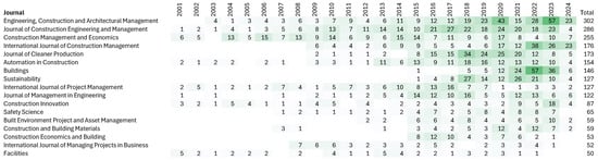Based on the keyword and theme network analysis, it is found that sustainability, green buildings, life cycle assessment, BIM, energy efficiency, architectural design, structural equation modelling, social network, and construction waste are relatively recent research topics in Australia. For a more detailed temporal understanding of popular research topics explored by Australia-based CEM studies, a matrix was developed (see