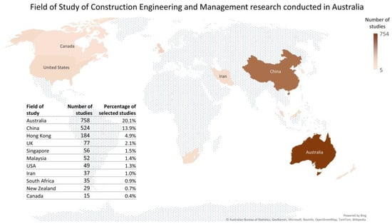 Figure 12). The analysis also showed that 520 (13.8%) publications out of 4318 (100%) reviewed studies have ‘China’ as their field of study, implying that even though the studies were partially or fully affiliated with Australian institutions, they focused on the Chinese construction industry. A detailed analysis of these publications revealed that, in most cases, these studies are led by Chinese academics who collaborated with CEM scholars in Australia. Based on the h-index of the first authors, it is judged that many of the academics in these publications are postgraduate (master’s or PhD) researchers in Chinese universities collaborating with Australian academics, while some of the academics are postgraduate researchers in Australian universities collaborating with Chinese academics. A significant number of these studies are co-authored by well-established CEM academics in China and Australia. This finding is also supported by the high number of studies (