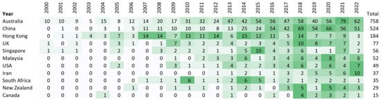 Figure 12. Australian and Chinese academics have collaborated on up to 1275 studies, implying that 30% among all selected studies are the result of Australia–China collaboration. Other than this, the most notable collaborations of Australia are with the UK (