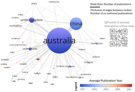 Figure 14), it can be observed that the collaboration of Australia with China, the UK, the USA, and Singapore is not recent. On the contrary, the collaboration of Australia with Iran, Malaysia, and New Zealand is relatively recent.