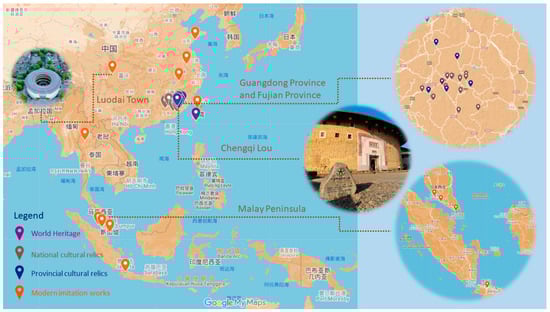 Distribution of architectural works related to earthen houses (Tulou). (The small Chinese characters in the picture denote the country names originally on the base map).