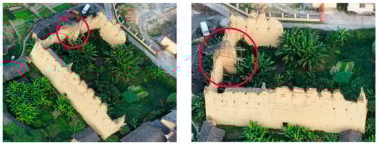 (1) Stains. Stains on the surface of wood used in Tulous mainly stem from two causes: tourist activities and improper maintenance. Following the development of Tulou tourism, the resulting increase in the number of tourists has had a certain impact on the surface of the wood, leaving hard-to-remove stains. Also, food residue and beverage spills from tourists may leave stains on the wood surface. Apart from tourist factors, Tulous’ daily maintenance and repair processes, if improperly conducted, can also lead to the formation of stains on the wood’s surface. The use of inappropriate chemical cleaners, paints, or coatings may leave hard-to-remove stains or cause discoloration of the wooden surface. In the repair process, improper construction and the use of inappropriate materials affect the aesthetics of Tulou wood and may damage the wood over time (Figure 7).