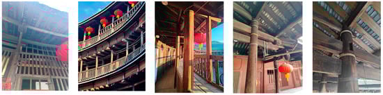 The method of supporting the floor reflects an organic combination of earth and wood structures: the outer side is supported on the load-bearing earthen wall, the inner side is supported on the column, beams and trusses are set in between, and the floor is laid on the rafters and reinforced with natural bamboo nails. At the same time, the end of the rafter supported on the earthen wall is slightly elevated to accommodate the height change after the earthen wall is air-dried and shrinks, showing the builders’ profound understanding of material properties and their responsive measures. The roof of the Tulou adopts a column–beam wooden frame structure, similar to the practice in other traditional residences in China. The large quantities of wooden components used in mainstream Tulous also expose them to the risk of wood damage. The wooden structure necessitates long-term maintenance checks, timely observation, and fire protection for the wood materials. These structures have generated numerous safety hazards, and the overuse of the wooden structure’s bearing capacity during influxes of large numbers of tourists [81] has also resulted in significant costs and safety issues for the protection and maintenance of Tulous.