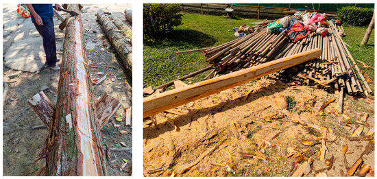 In traditional craftsmanship, wood is often treated via carbonization or painting to enhance its durability. However, influenced by commercialization and the decline of repair techniques, maintenance practices often lean towards cost-effectiveness, sacrificing the complexity of craftsmanship (Figure 5). A lack of adequate dehydration and pest-control treatment compromises the durability and structural integrity of wood, making it susceptible to damage. The climate in which Tulous are situated is characterized by high humidity and frequent rainfall, making the wood susceptible to moisture. Long-term sun exposure in the summer and high-humidity environments provide conditions for the growth of mold, leading to phenomena like cracking and holes in the wood, thereby shortening its lifespan. Current maintenance and repair techniques, to some extent, do not appropriately address the challenges posed by these natural and human factors. The loss of craftsmanship skills leads to the inability of repair projects to restore the original weather resistance and biological invasion resistance of the wood, further exacerbating the vulnerability of the wooden structure.