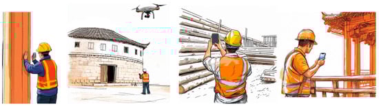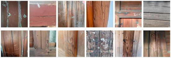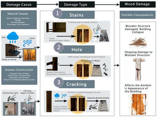 (1) Material collection stage: The diversity of material sources and the representativeness of materials are critical for ensuring the model’s stability and generalizability, which directly affect its practical utility. Therefore, during the material collection phase, we placed significant emphasis on acquiring a broad and representative range of images depicting damage to and human-induced stains on wooden structures. In typical Fujian Tulou locations, we collected 1506 high-definition images of various types of damage to wooden components. We collected images under different climatic conditions (sunny, overcast, and rainy) and varying lighting conditions (natural sunlight, shadows, and artificial light sources) to comprehensively cover variations observed in real-world scenarios. We aimed to capture the diverse manifestations of damage under various environmental conditions during a month-long data collection effort. Furthermore, to ensure that the collected data effectively reflected the characteristics of various types of damage, we focused not only on the diversity of damage types, such as water stains, surface scaling, color changes, and abnormal gaps, but also on the severity, size, shape, and color variations of the damage.