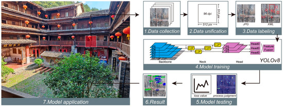 In this investigation, we employed a rigorously tested and effective methodological approach, delving into the potential utility of computer vision technology in identifying damage to wooden components within Fujian Tulou, recognized as World Heritage Sites. The research encompassed the entire spectrum from data gathering to practical deployment. Within this framework, we developed and tested an automated method for detecting damage in wooden components using the YOLOv8 model. The objective of this study was to meld computer vision technology with the specific conservation needs of historical architecture, creating a model that can precisely and efficiently assess damage to wooden constructions. We designed this model to provide significant technological support for the long-term preservation of Fujian Tulou and other wood-based traditional buildings, with the goal of applying these advancements to real-world heritage preservation tasks. The research process is shown in Figure 10.