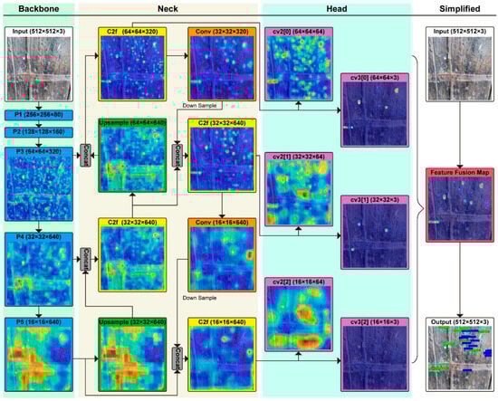 The network framework of the YOLOv8 model is shown in Figure 11. The architecture of this model consists of three main parts: the backbone network, the neck network, and the head network. These parts are responsible for feature extraction, feature fusion, and final detection prediction, respectively.
